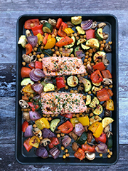 Check the vegetables, and once you see them starting to darken in color, season and oil the sliced salmon, then put back. Don't forget to add chickpeas. Squeeze a lemon over the salmon and serve!