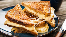 Brush each slice generously with butter. Place the slices buttered-side down into the cooking container, reserving the cheese slices and covering them with the 2 buttered slices. Place the tray on the bottom of the cooking cavity and select Airfryer mode. Set the temperature to 375 degrees and cook for 10 minutes. When ready, remove sandwiches and serve with cheese sauce.