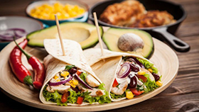 2. Add chicken, bell pepper, red onion and lettuce to each tortilla.