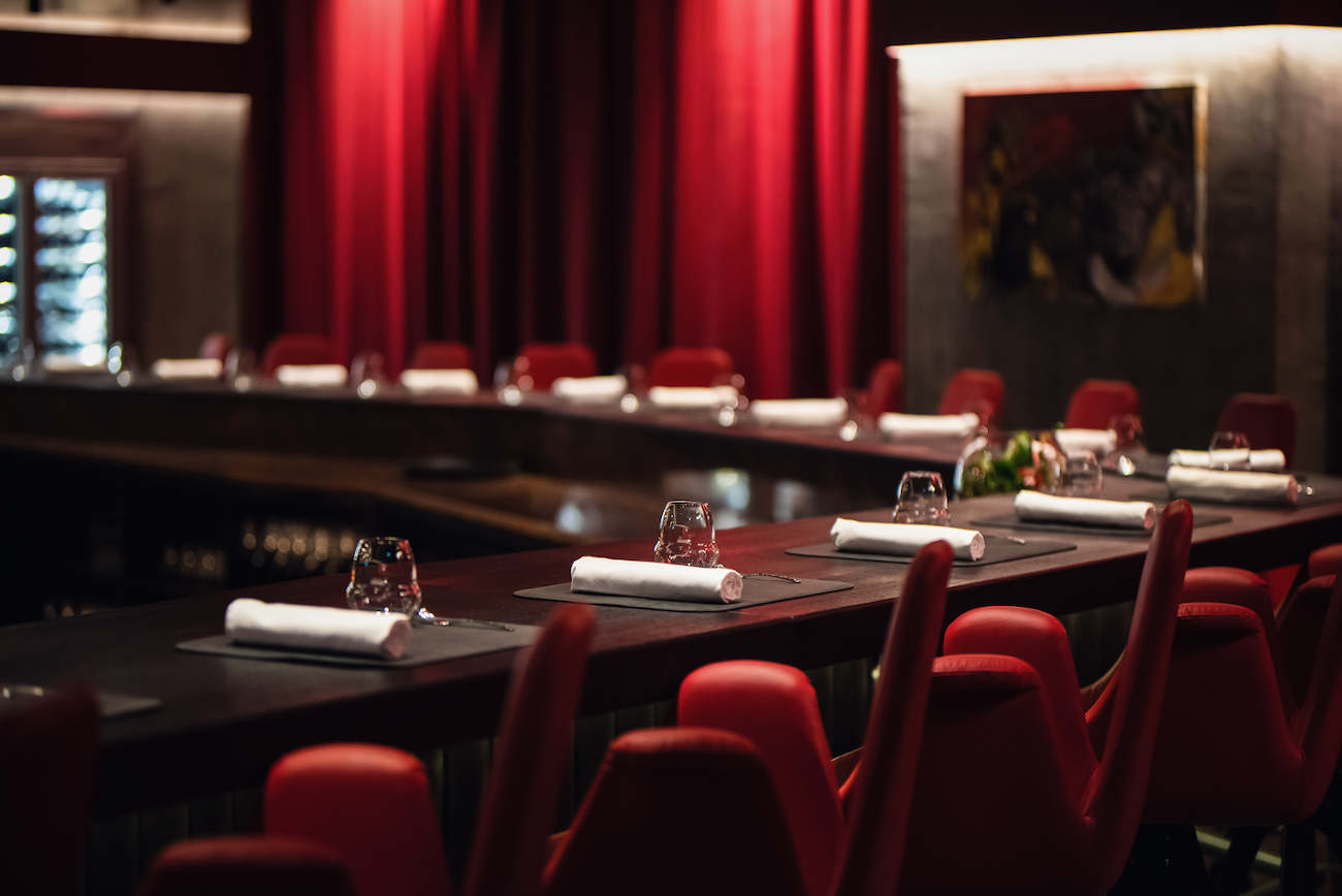 When you arrive at Rumour, on the vibrant side of town centre and Pest, you may be looking for the front door. From the street you can only see the large windows covered with heavy velvet curtains. Nothing really shows you're standing in front of a gourmet restaurant. You actually have to walk through a tempting deli filled with delicious artisanal products to get into the dramatic two-story rumour. The restaurant is built around a huge open kitchen -- "a concept I've always liked," says chef Jenő Rácz -- with a long counter in the kitchen. Guests sit on elegant red bar stools. You're a viewer of a great cooking show that unfolds over 11 courses...and just as many wine or cocktail pairings.