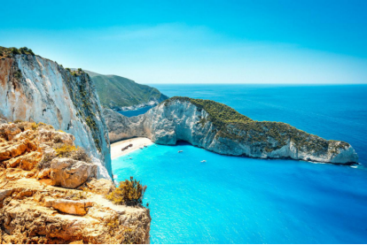 Navagio Beach is a small sheltered cove in Greece that is jam-packed with nature's outclass masterpieces such as crystal clear blue water, limestone cliffs, and silky white sandy beach, making it a popular tourist destination. The only way to access Navagio Beach is by boat, but from the tops of the surrounding cliffs, you can obtain a panoramic view of this stunningly gorgeous beach.